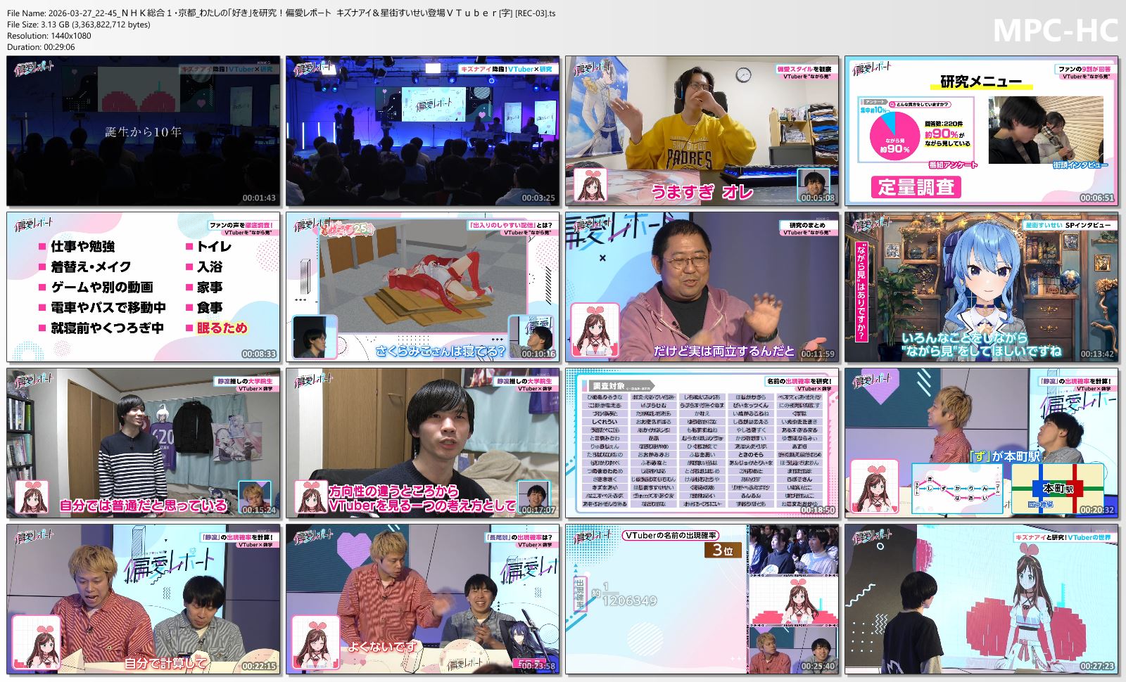 大学生が自分の「好き」を研究し発表するプレゼンバラエティー!テーマはVTuber。キズナアイの登場から10年、日本発のネットカルチャーを深掘り!▼ファンのあるある「ながら見」を社会学の視点で調査!さくらみこの長時間配信と「ながら見」に密接な関係が!?▼星街すいせいが自身の配信について語る貴重なインタビュー▼VTuber299人の名前の出現確率を「マルコフ連鎖」で分析!奇跡の数値に会場&親分も騒然!